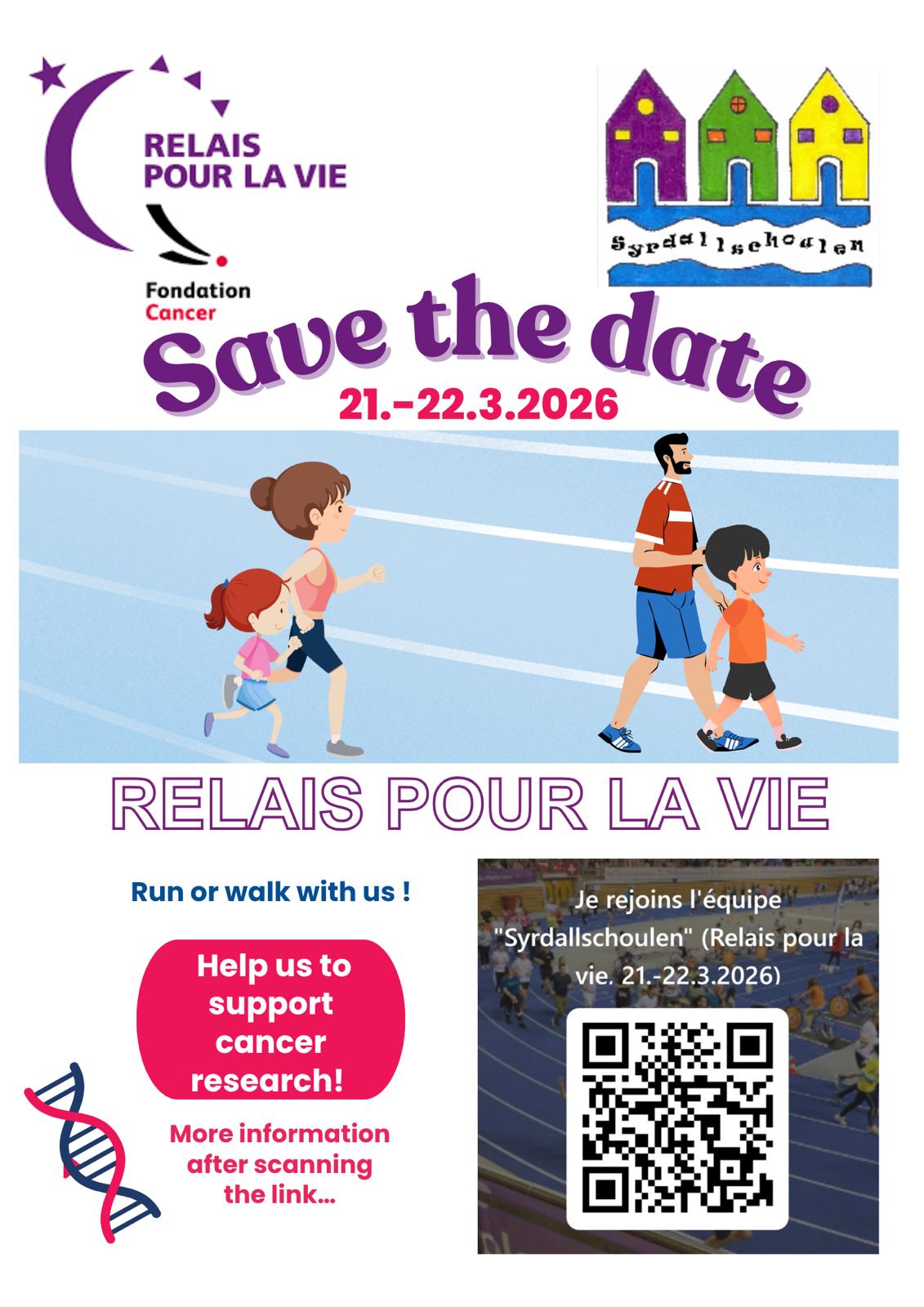 Nous avons le plaisir de vous informer que les Syrdallschoulen participeront à nouveau au Relais pour la Vie organisé par la Fondation Cancer les 21 et 22 mars 2026. 💜